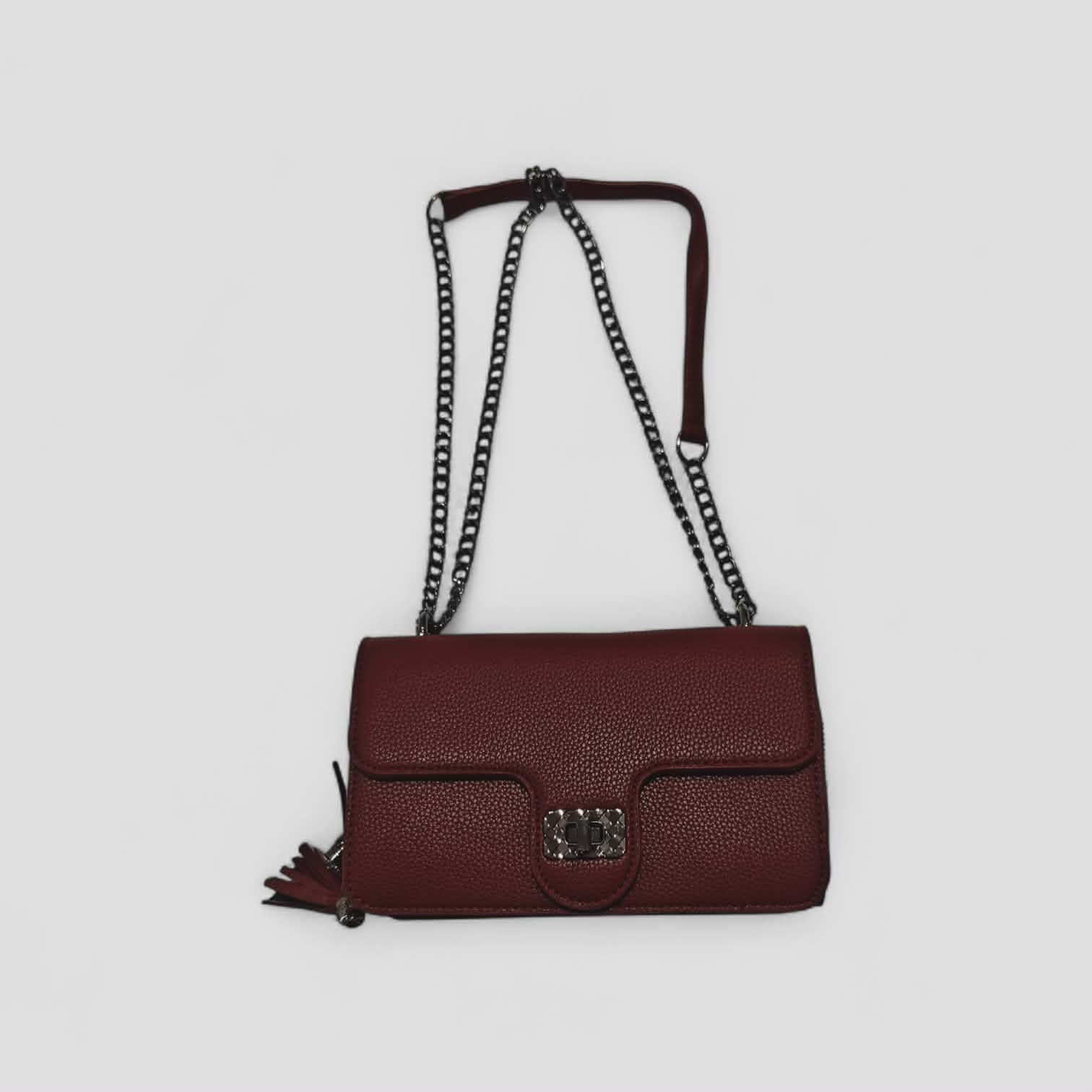 Κομψή γυναικεία τσάντα ώμου σε εντυπωσιακό μπορντό χρώμα που προσθέτει στυλ σε κάθε εμφάνιση. Διαθέτει καπάκι με διακοσμητικό μεταλλικό κούμπωμα και λουράκι με αλυσίδα που προσφέρει μοντέρνα και κομψή αισθητική. Ο πρακτικός σχεδιασμός της προσφέρει επαρκή χώρο για τα απαραίτητα αντικείμενα της καθημερινότητας, ενώ μπορεί να φορεθεί άνετα στον ώμο ή χιαστί. Ιδανική επιλογή για καθημερινές αλλά και βραδινές εμφανίσεις.