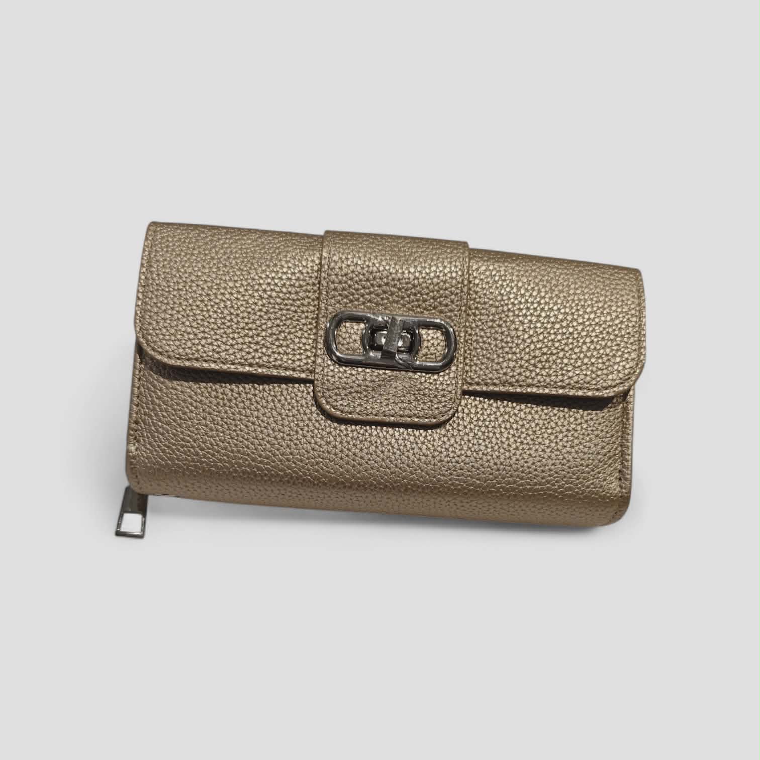 Κομψό γυναικείο πορτοφόλι από υψηλής ποιότητας συνθετικό δέρμα σε εντυπωσιακή χρυσή απόχρωση. Διαθέτει πρακτικό μεταλλικό κούμπωμα που προσφέρει ασφαλές κλείσιμο και μοντέρνα εμφάνιση.